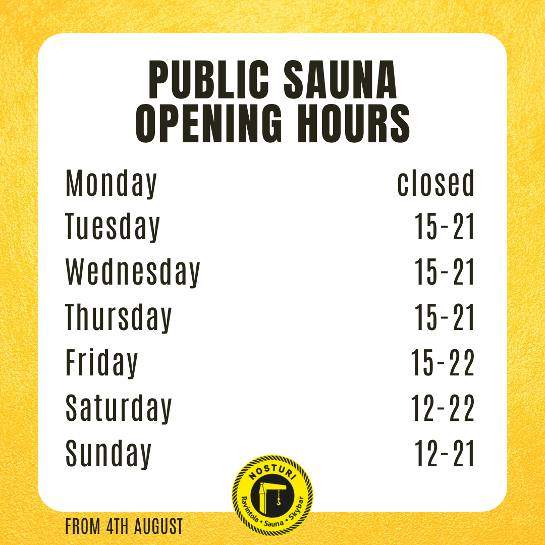 In the summer, the public sauna is open on Tuesday, Thursday and Sunday. You don’t need to make a reservation for public sauna!